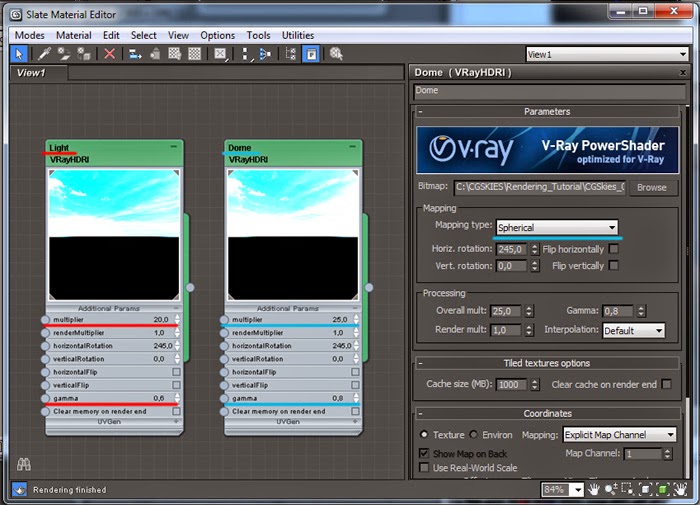 Bây giờ ta sẽ ốp vật liệu HDRI lần lượt cho 2 Vray dome, tương tự đặt tên cho 2 vật liệu này là Light và Dome. Tôi khuyên các bạn nên xài kiểu map “3ds max standard” cho map HDRI sẽ linh hoạt hơn cho bầu trời của chúng ta sau này.