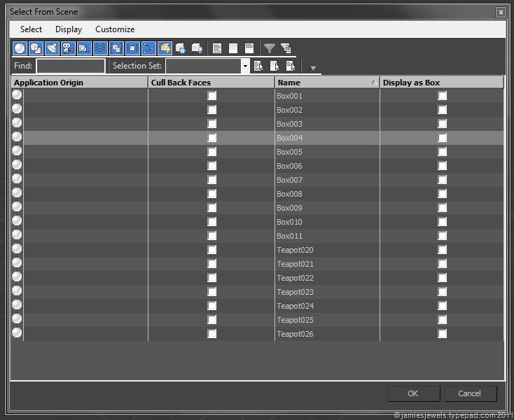 29. Trong bảng Select from scene (phím tắt H), click chuột phải vào dòng Name chọn Configure Columns và kéo chuột các Option bạn muốn (để quản lý các đối tượng có trong khung cảnh).